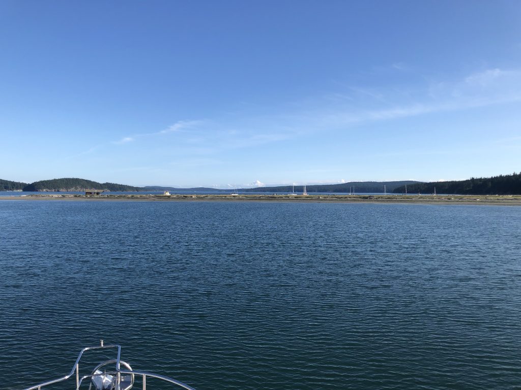 Spencer Spit has long been a favorite spot of ours in the San Juans and it nice to be back here early on this trip. Sandy beaches, driftwood forts and walking trails make this a fun place to visit with kids. The protection is surprisingly good, even with a frequent ferry that runs through Lopez Pass. The scenery is breathtaking. Here’s a view south over the spit from the flybridge: