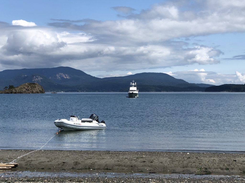 Spencer Spit has no dock, so we’ve used our anchor buddy to keep the heavy tender floating while we go ashore. I’ve been wanting to try this out and it’s dead simple to use. I’m kind of amazed that it works so well. We’ll see how I feel about it tomorrow at six in the morning when the dogs need to go ashore.