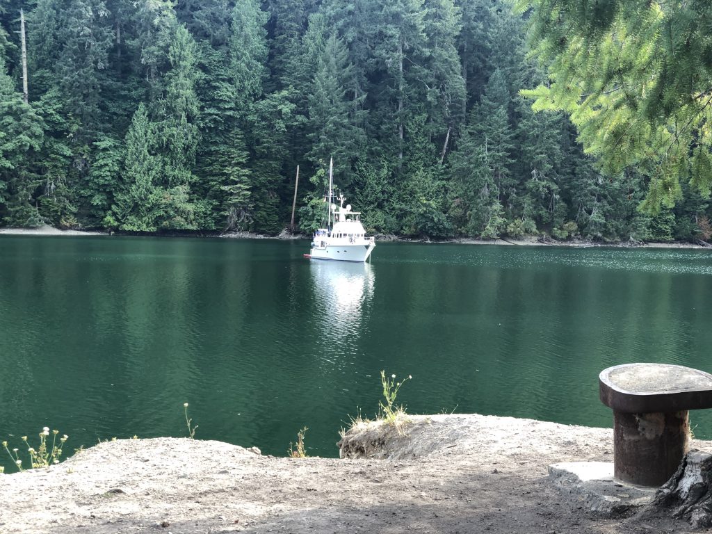We then took the short passage to Tod Inlet, a beautiful little bay just south of Brentwood Bay. We anchored in about 20 feet of water close to three nearby boats. We’re always amazed at how close other boats look from the wheelhouse, but far away from the tender or ashore. There were about twenty boats in the little bay during our stay but learned from a local that upwards of 200 boats squeeze into the harbor on Saturday night to watch the Butchart Garden fireworks. Local boaters avoid the place on the weekend for this reason. “You can basically step from boat to boat,” he laughed. Yikes. I’m glad we were here during midweek.