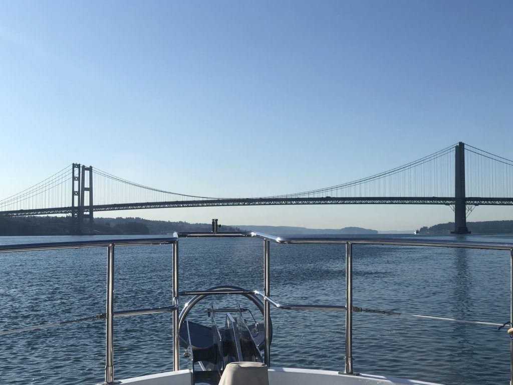 We departed Quartermaster Harbor on Tuesday morning to catch a favorable flood tide through the Tacoma Narrows. Currents run pretty fast through here and sailboats and trawlers can only safely travel through on the right tide.