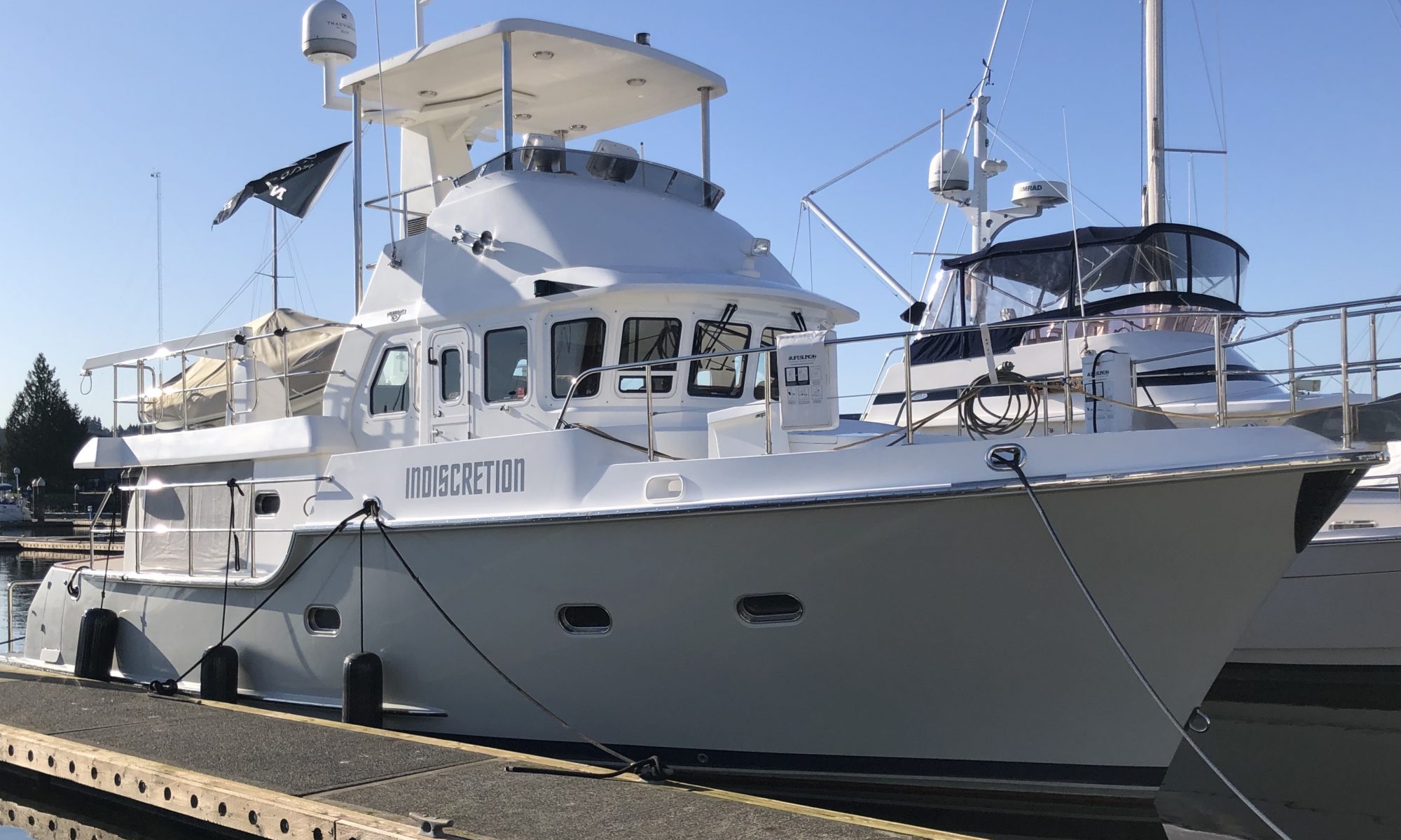 It was a moonless night, so we couldn’t see the seals as they swam nearby in the darkness. We tried to spot them with a flashlight, but they all disappeared under the water with a hilariously loud splashing sound once we aimed the light. Fortunately, Indiscretion has a FLIR camera which allows daytime like visibility from the pilothouse. Turning the camera toward the island, we were astonished to see close to 40 seals in the water near us and sprawled out on the dark beach. They seemed quite curious of the boat, communicating with one another in their particular way. We have a three-foot swim-step at the stern of the trawler which would seem to make a comfortable lounging spot for one of these massive beasts. I waited for a lurch of the boat as one clambered aboard, but they kept their distance. We made off early the next morning to catch our tide through the Narrows and home to Quartermaster Marina.