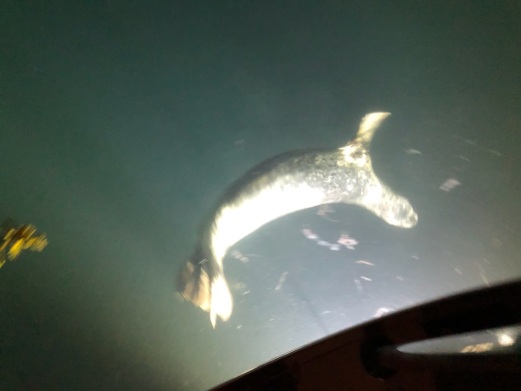 We moored up on the inside of breakwater D, the same place we tied up last year. The stern of Indiscretion faced the opening of the marina channel, so we got to see and wave at all the boats coming and going. After walking back to the boat after a nice dinner ashore, we noticed many boats had their underwater lights on for ambiance. We decided to turn ours on as well. Once illuminated, hundreds of squid swarmed the lights, and just moments later, a very agile seal swam in figure-eight loops right around our swim-step, devouring the squid. It stunned us all. We were slow to get our camera out, but here is the seal near the end of his feast: