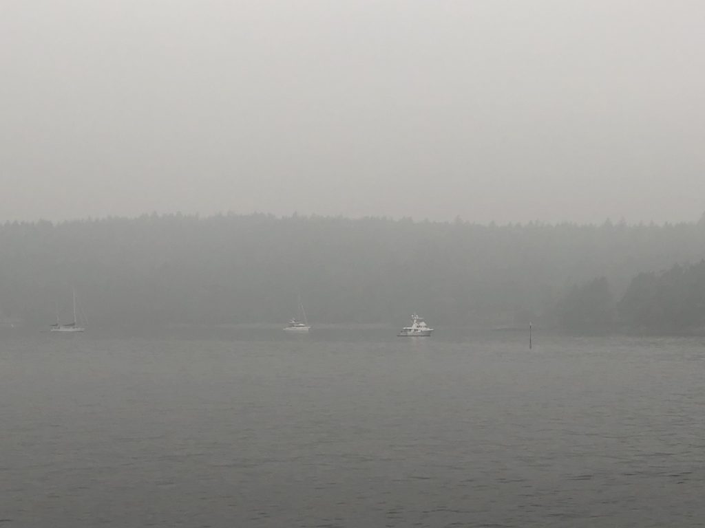The smoke from all the forest fires burning in Eastern Washington, Oregon and California finally reached the islands as we motored from Friday Harbor to Blind Bay on Shaw Island. A little patchy fog mixed in with the smoke to made the trip visually challenging, though we could see quite well with radar.