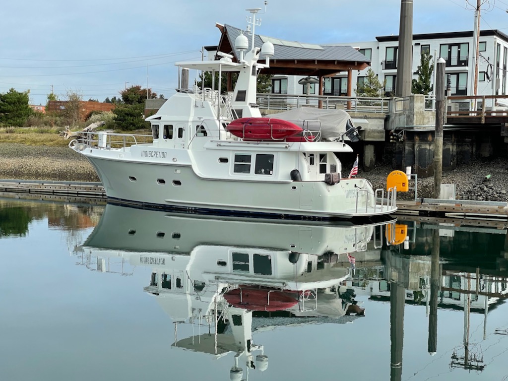 Lisa and I have perfected our departure logistics. We work through our departure checklist: the forced-air hydronic heating system and navigational instruments are switched on in the pilothouse. Lisa stows the groceries and readies the cabins for sea. I visit the engine room to check oil, fuel filters, belts, and coolant levels. Lisa finagles the half-fender covering our exhaust stack with a boat hook (our low-tech way of keeping rainwater out) and pulls off the instrument covers at the flybridge helm. I fire up the main engine and energize the stabilizers. Lisa hands me the shore power cords from the dock as we talk through our departure from the slip: the wind strength, the order she’ll untie dock lines, etc. The whole process from start to finish now is under 20 minutes. We make a good team.