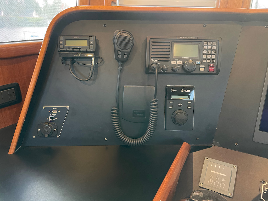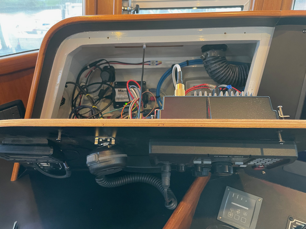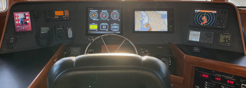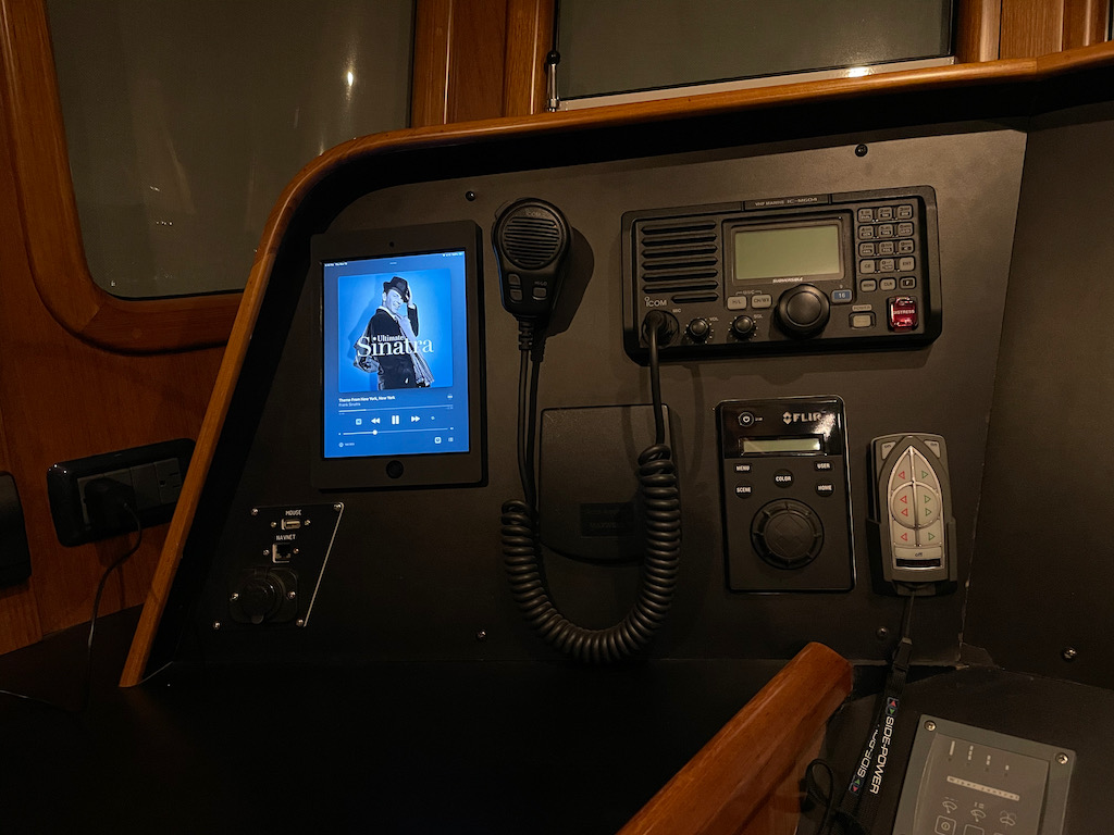 We had some empty space on the port side pilothouse dash, so we decided to replace the SiriusXM radio with a dedicated pilothouse iPad. This was the first time I made a significant modification to our electronics or dash layout. Unlike a car, the console of a Nordhavn trawler is meant to be easily customized. The dash consists of three adjoining plywood panels that can accommodate just about any layout you might want. If a complete revamp with new electronics is warranted, new dash panels can be designed online so that the cutouts for the new instruments are already in place. In the case of installing this iPad, the procedure was pretty easy.
